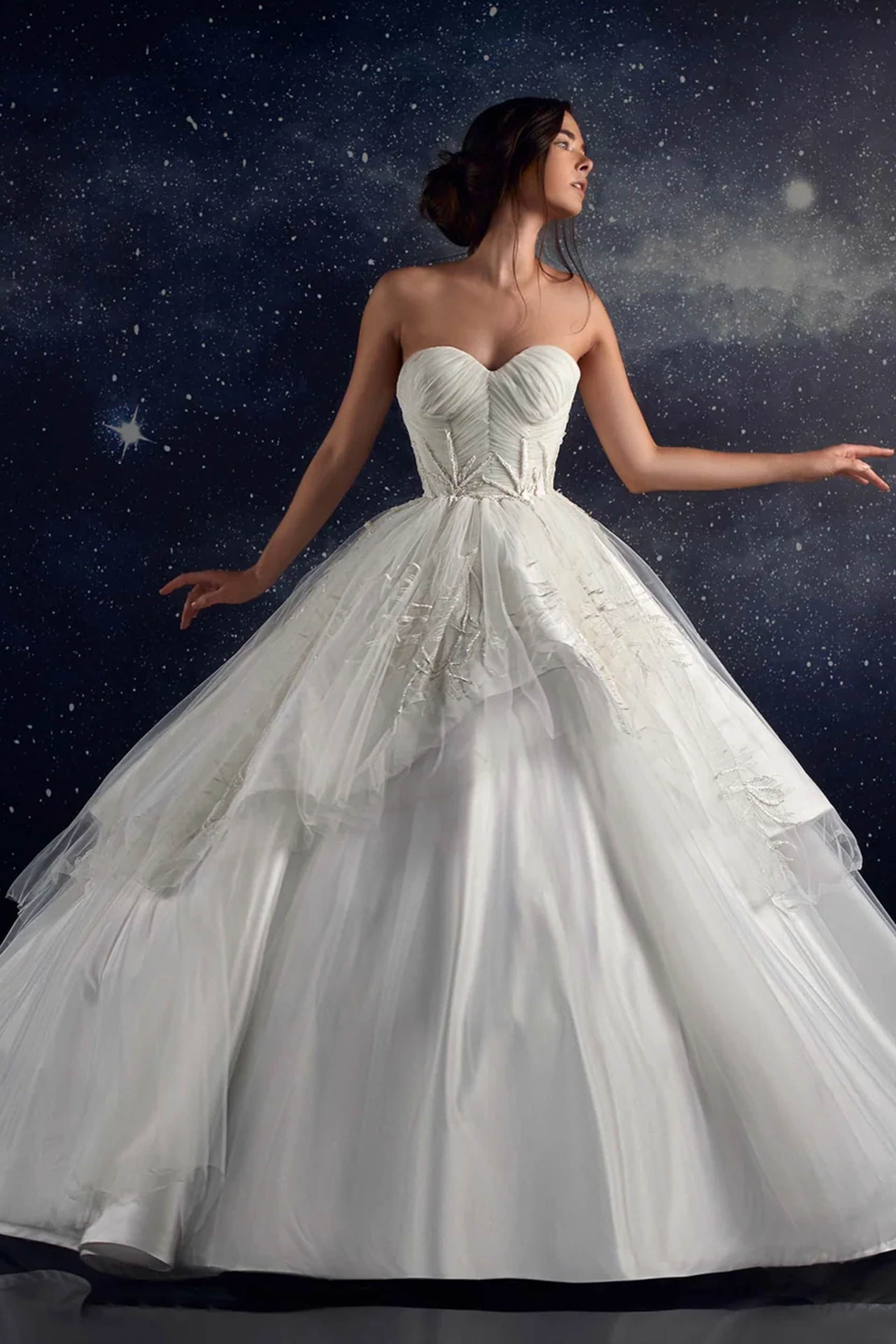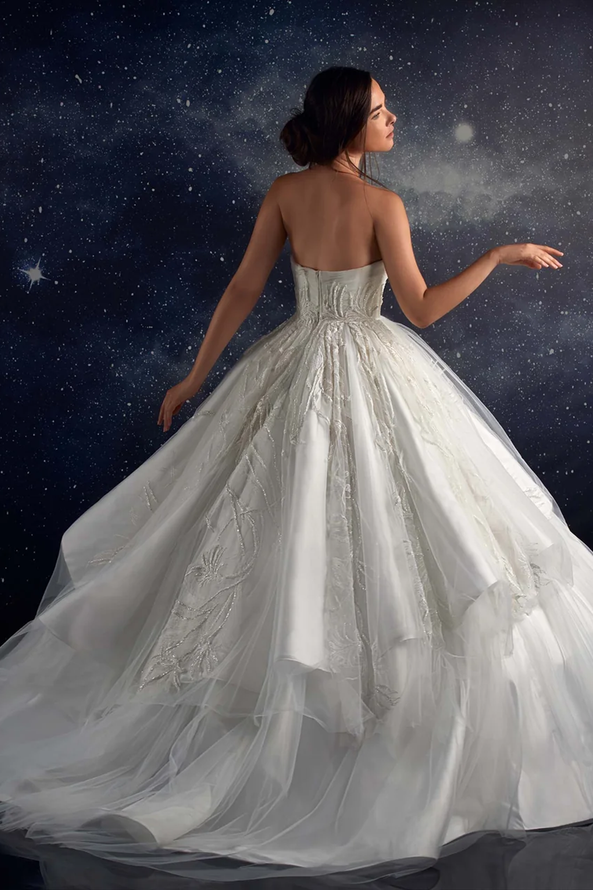The dress has a stunning and celestial backdrop, enhancing the overall dreamy and magical theme of the image.