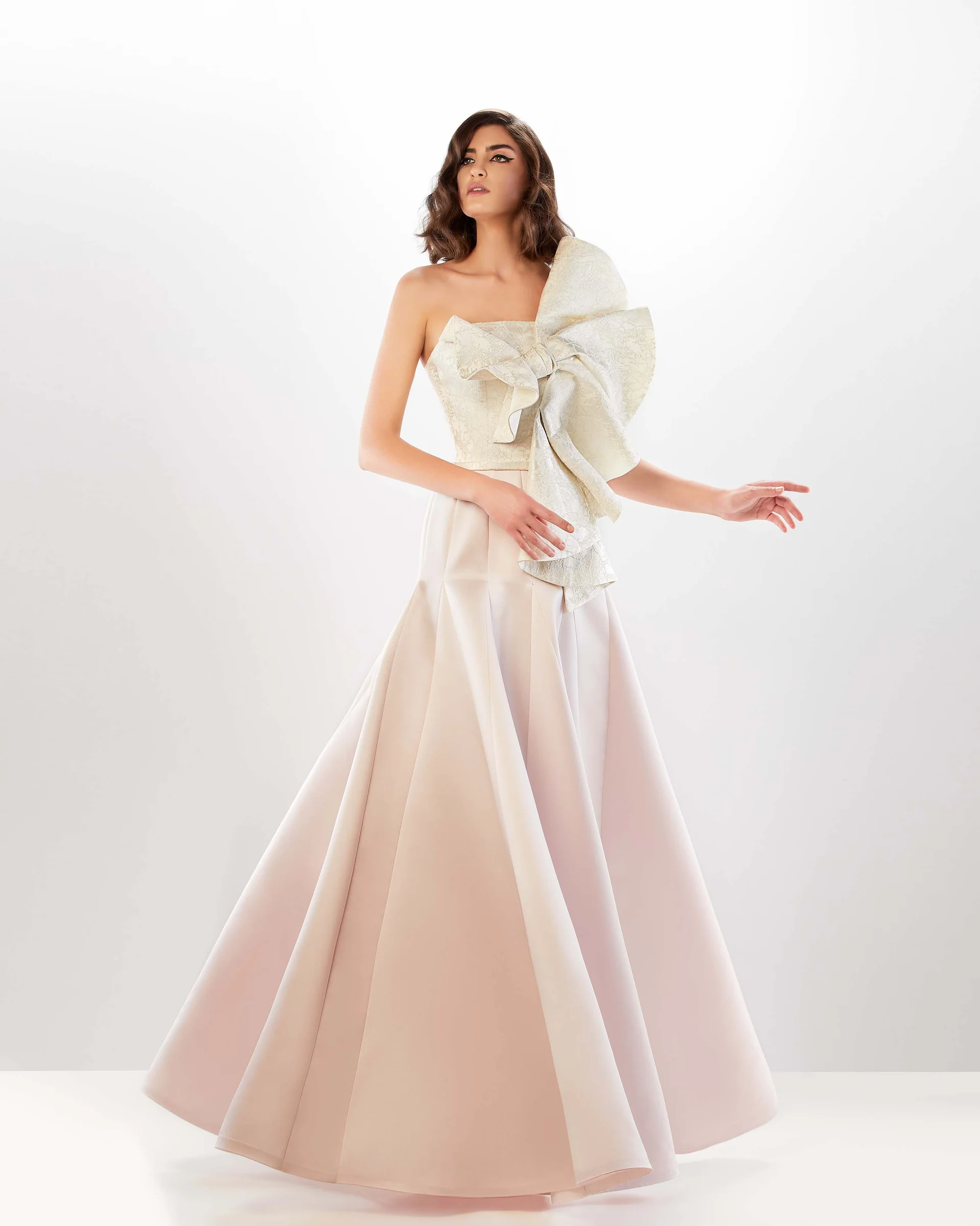 A brocade top with a draped bow paired with a satin long skirt creates an elegant and sophisticated ensemble, perfect for formal events or special occasions. The brocade fabric, known for its rich texture and intricate patterns, adds a touch of opulence and timeless charm to the outfit. The draped b ...