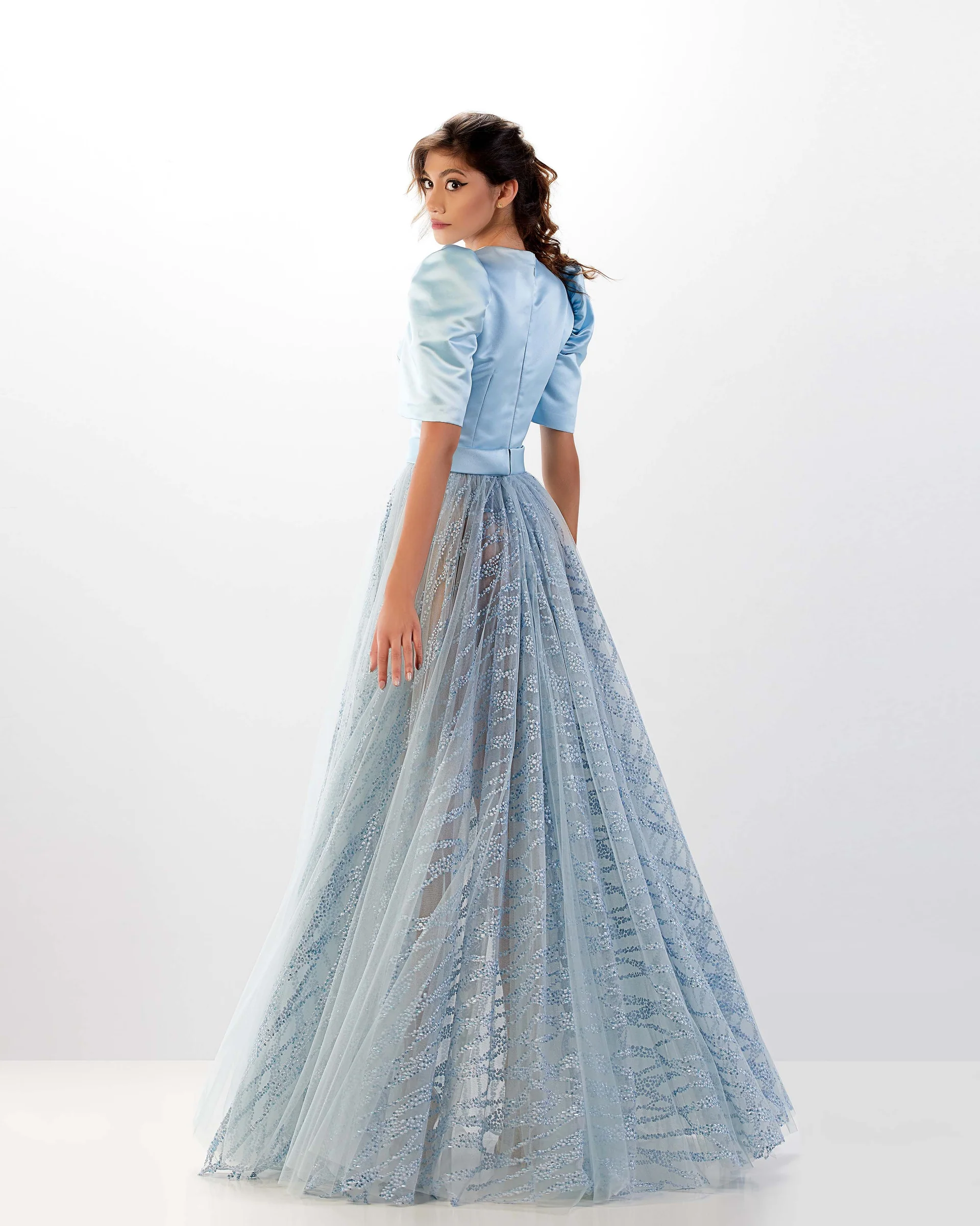 A stunning piece of evening wear, characterized by its elegant design and meticulous craftsmanship. The upper portion of the dress is tailored from a lustrous, satin-like fabric in a soft pastel blue, which exudes a sense of calm sophistication. This fabric choice ensures a sleek and polished appear ...