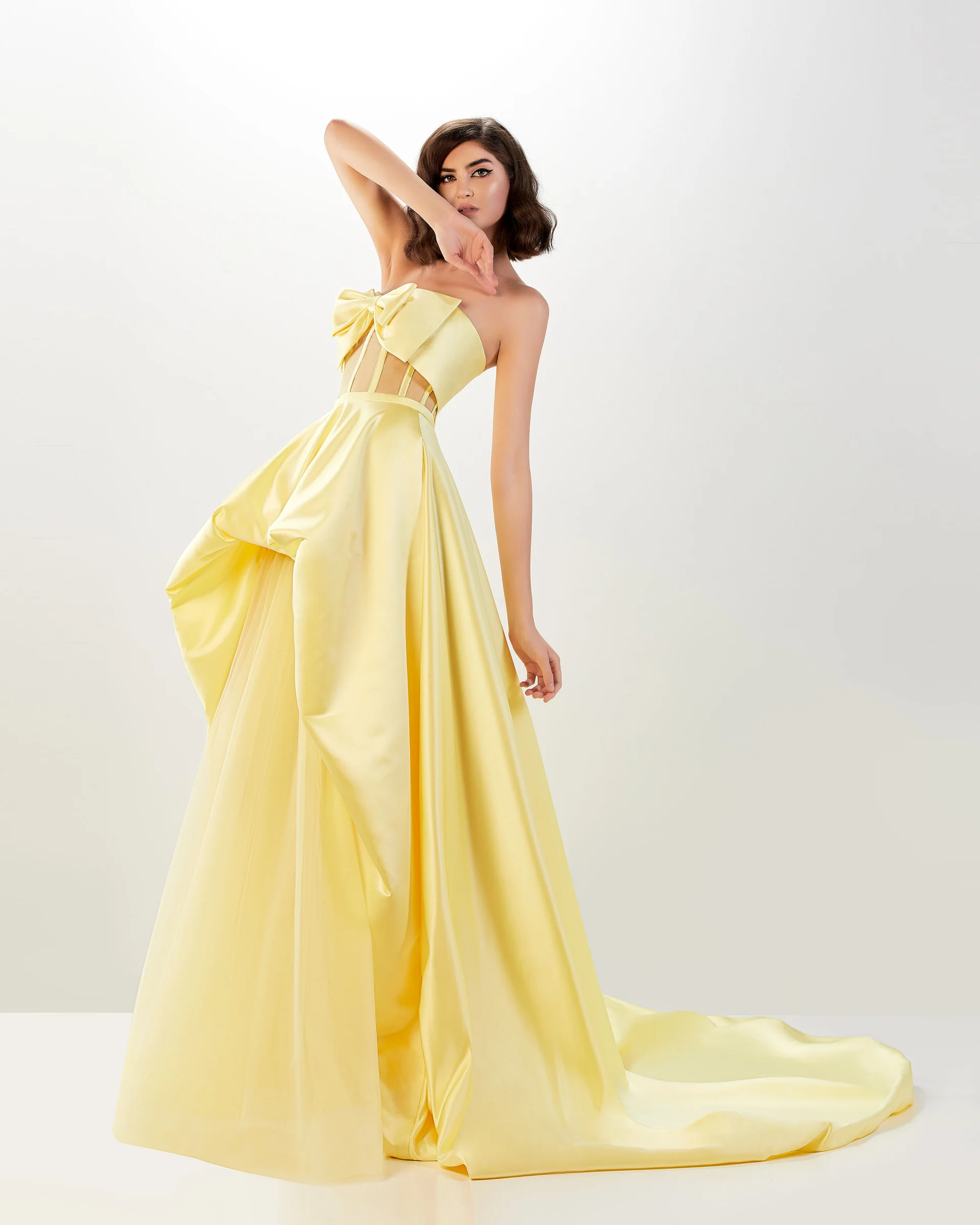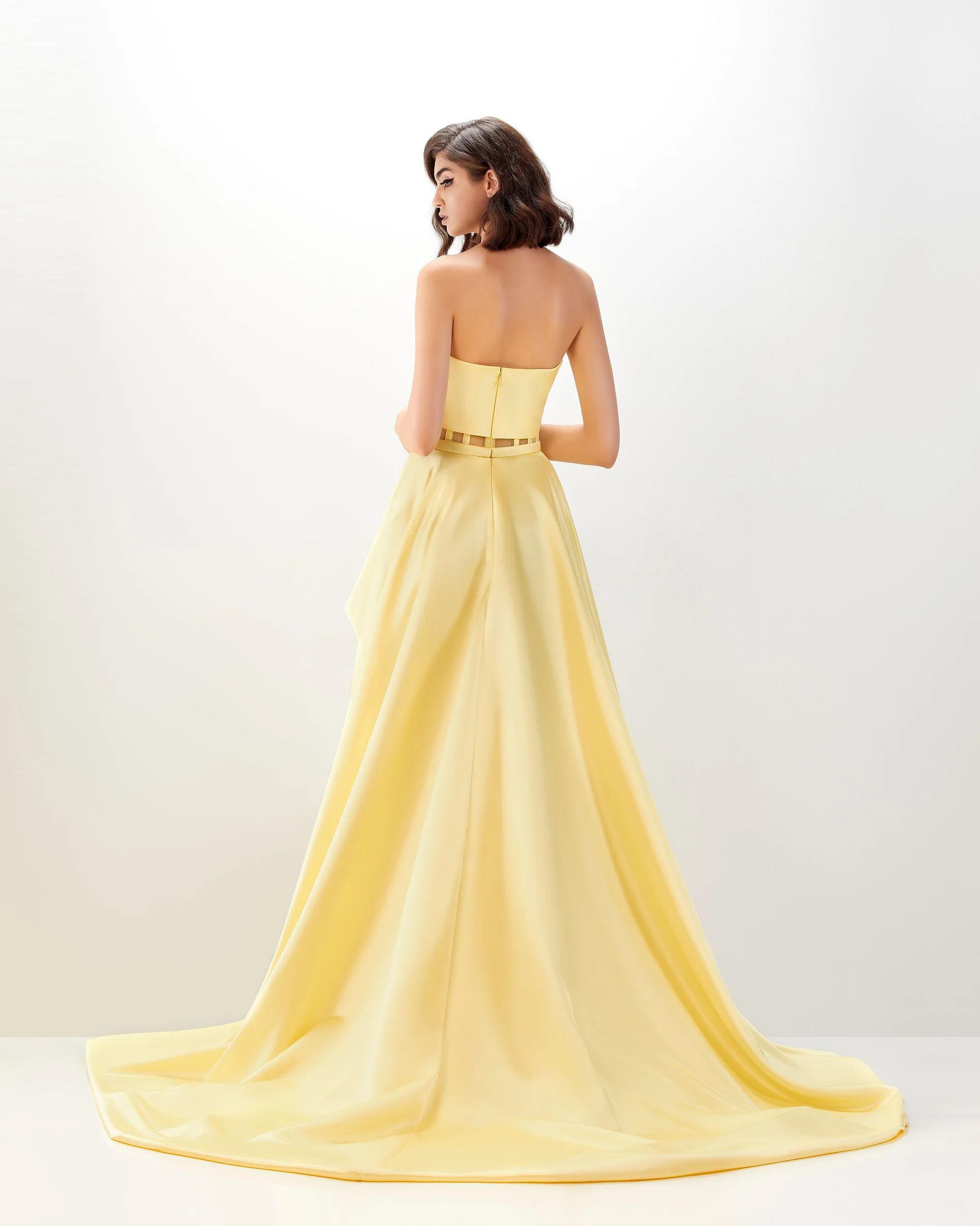 The strapless satin and tulle ball gown is a timeless embodiment of elegance and sophistication. Its structured satin bodice accentuates the figure while providing a smooth, luxurious texture. The voluminous tulle skirt creates a dramatic silhouette, adding a touch of whimsy and fairy-tale charm to ...