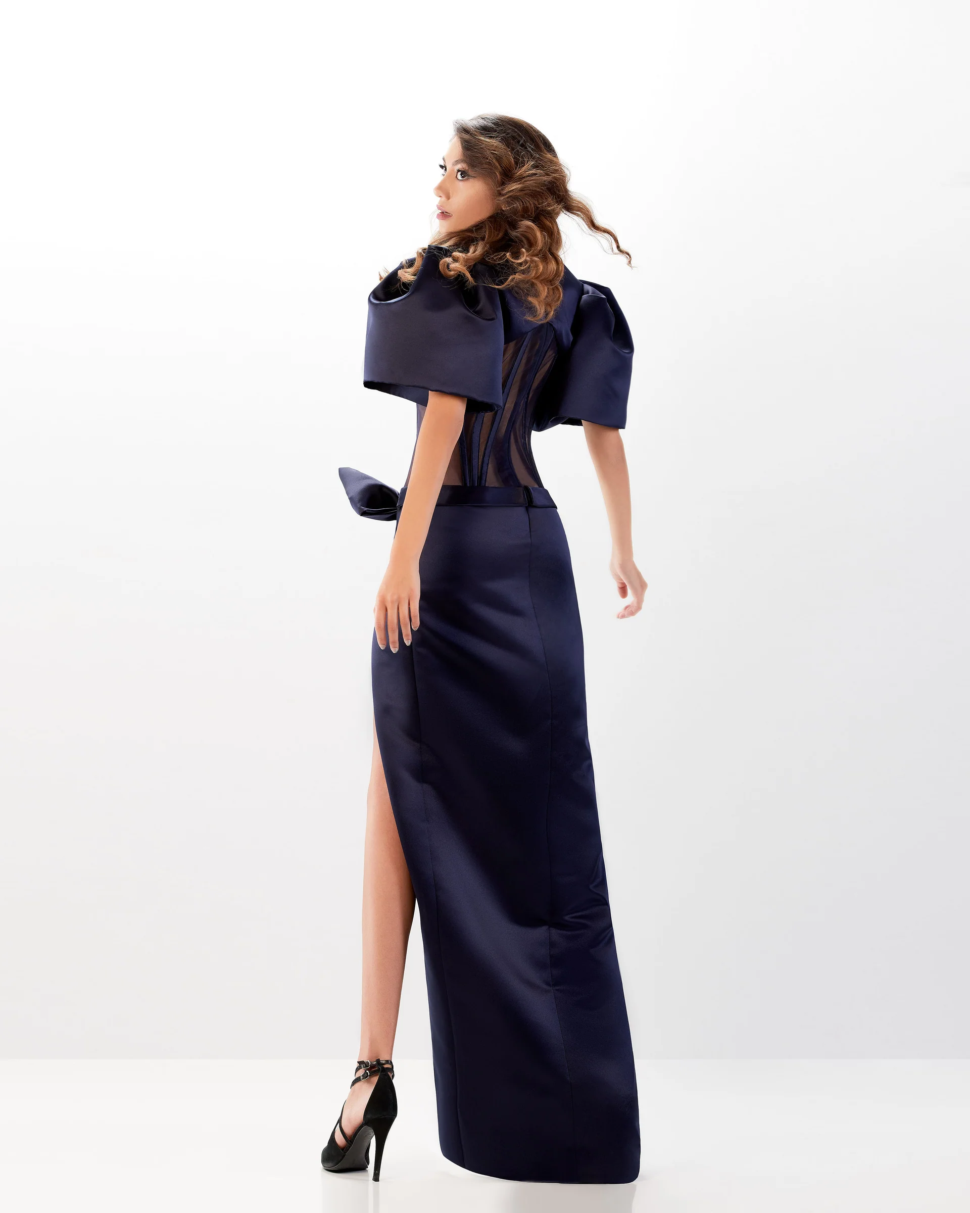 Satin and tulle long dress with puffy sleeves geometrical cuts and a slit.