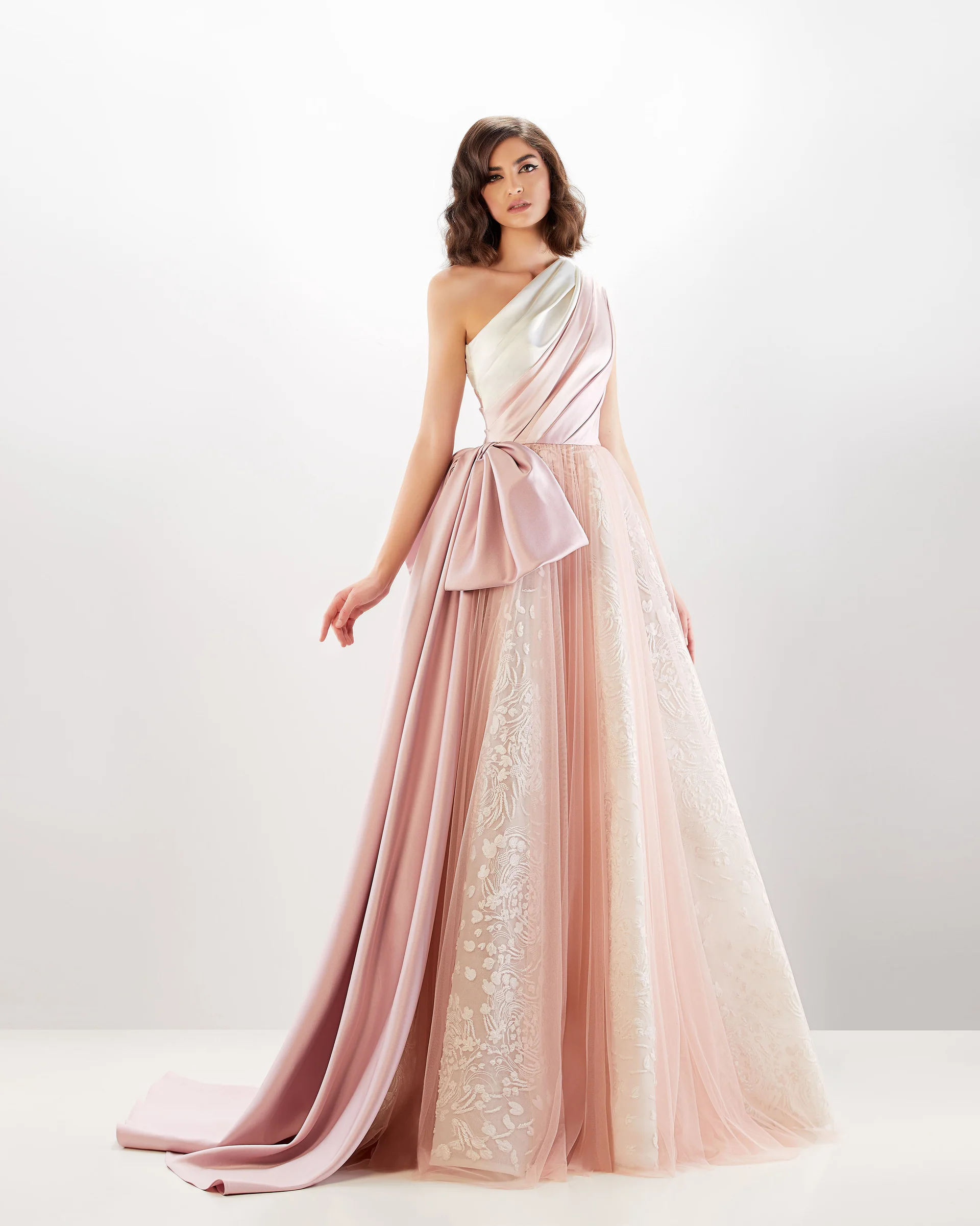 The satin ball gown features elegant draping and a gracefully tied bow, complemented by an intricately embroidered tulle skirt. This design blends luxurious fabric with intricate detailing, creating a sophisticated silhouette that embodies timeless beauty and refined craftsmanship. ...