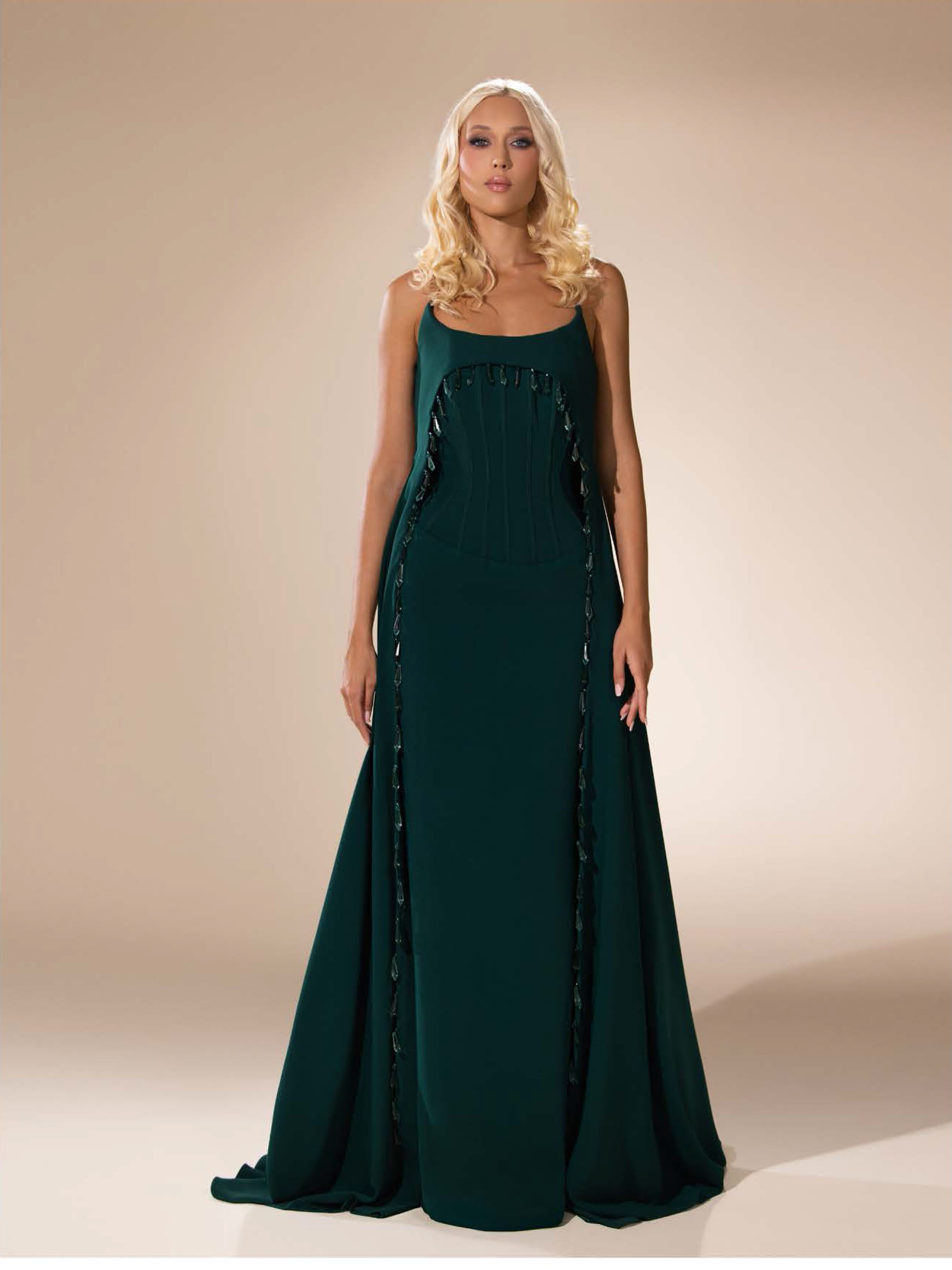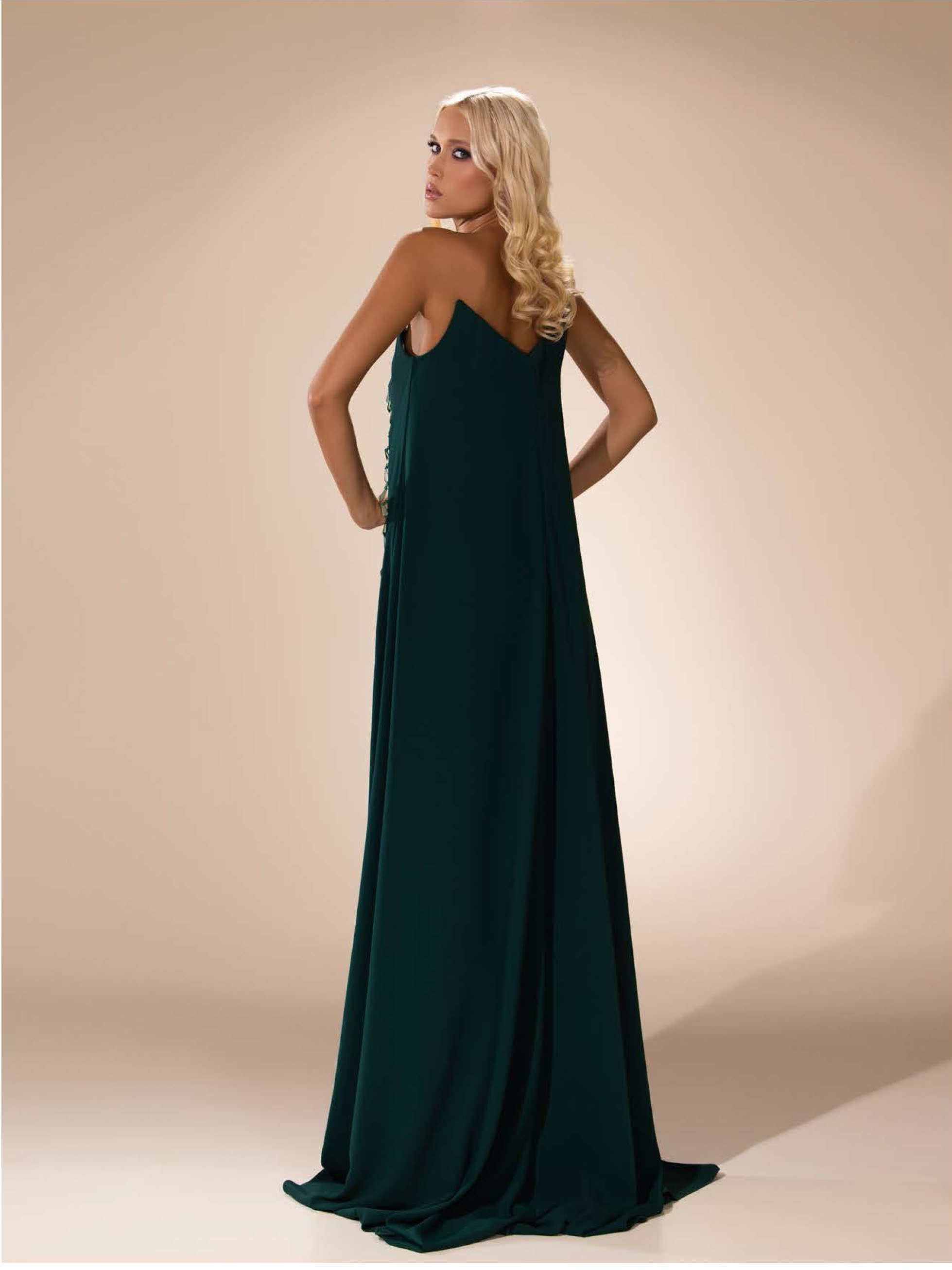Strapless crêpe evening gown with a cape-style slit and hand-embroidered crystal accents, merging fluid elegance with luminous detail.