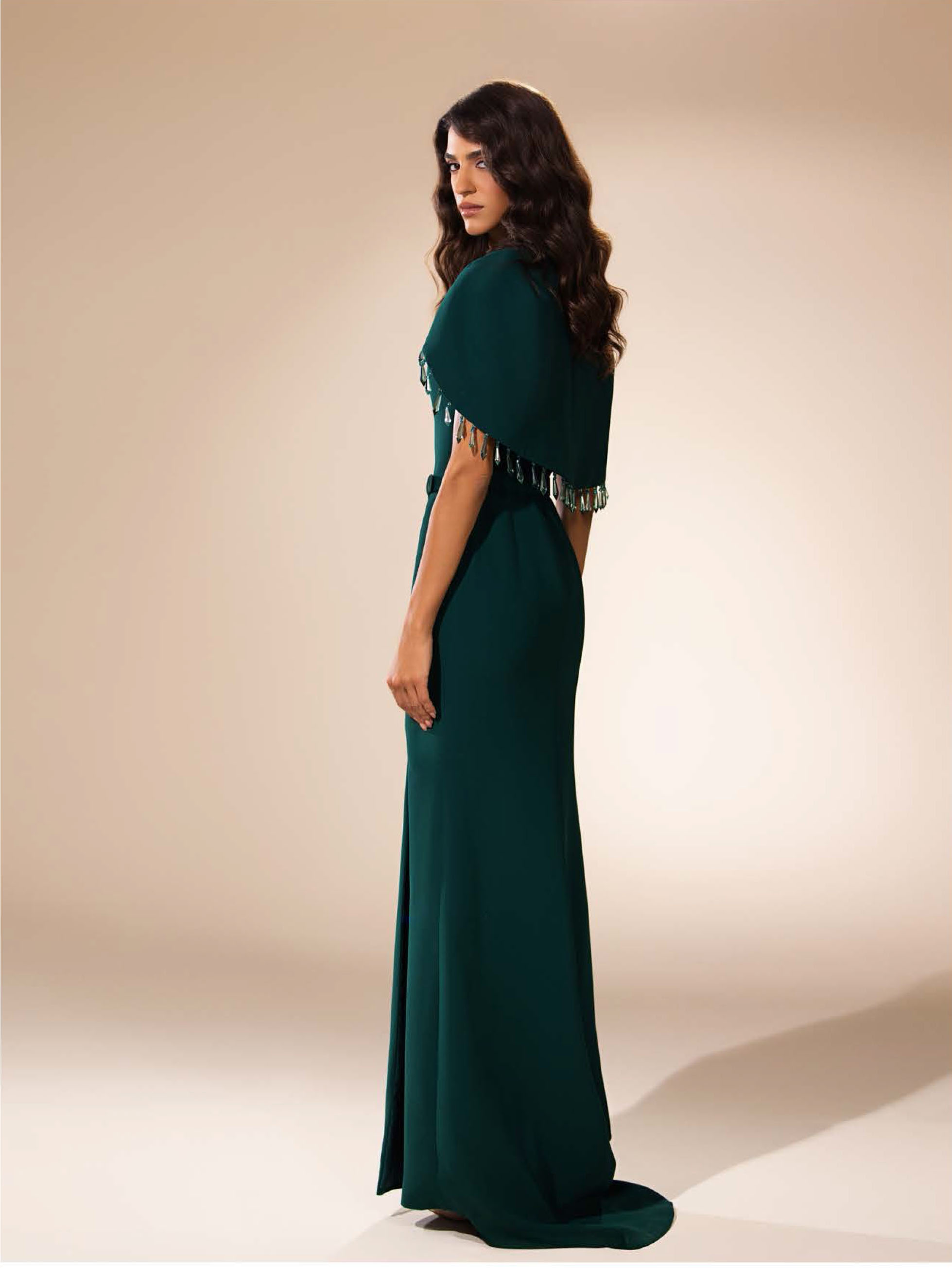 • Crêpe evening gown with a flowing cape, high slit, and embroidered crystal accents, radiating elegance and modern allure.