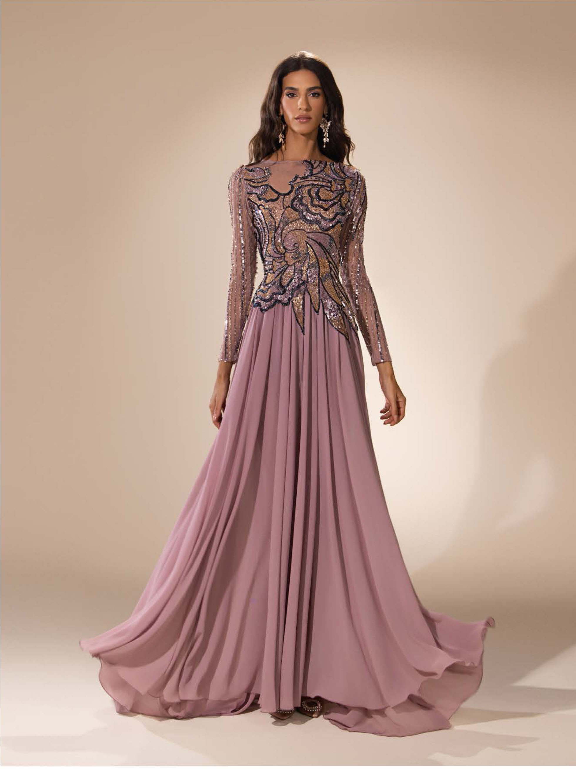 crêpe evening gown with floral-shaped embroideries, featuring sheer long sleeves and a high neckline.