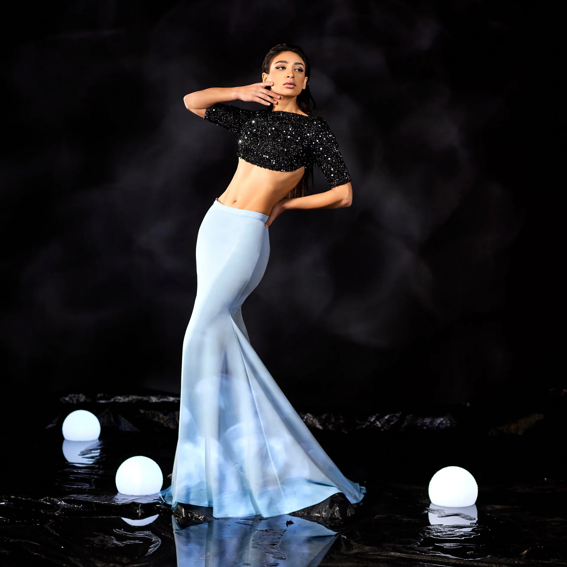 Material: Black fabric adorned with shimmering sequins, creating a dazzling, reflective effect.