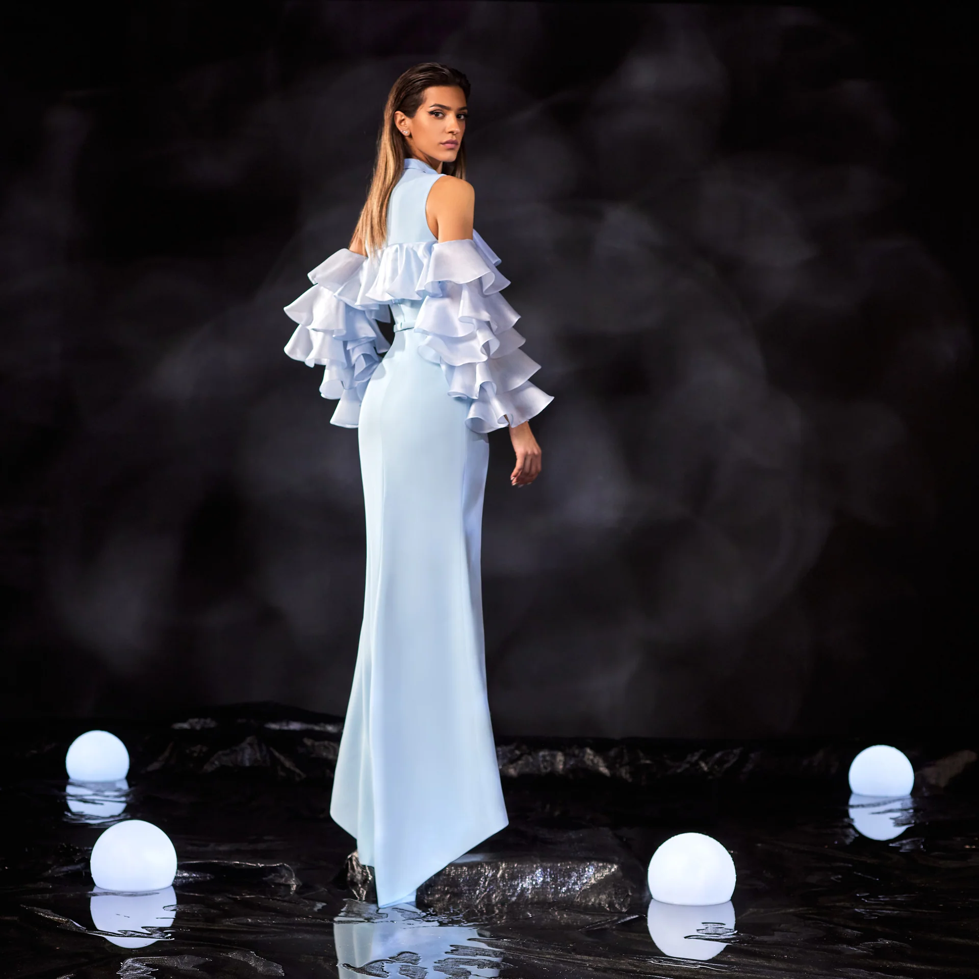 • Organza Sleeves: Voluminous ruffled sleeves in airy organza create a striking silhouette.