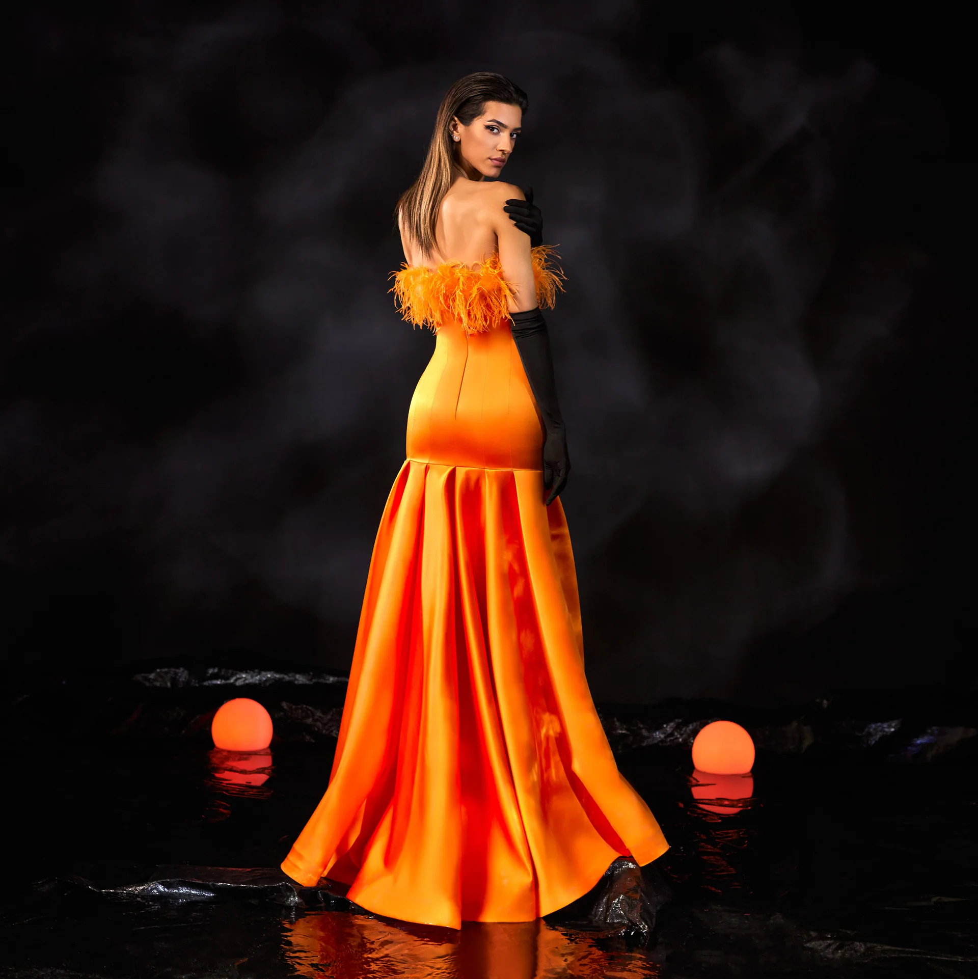 Satin Gown with Feathers