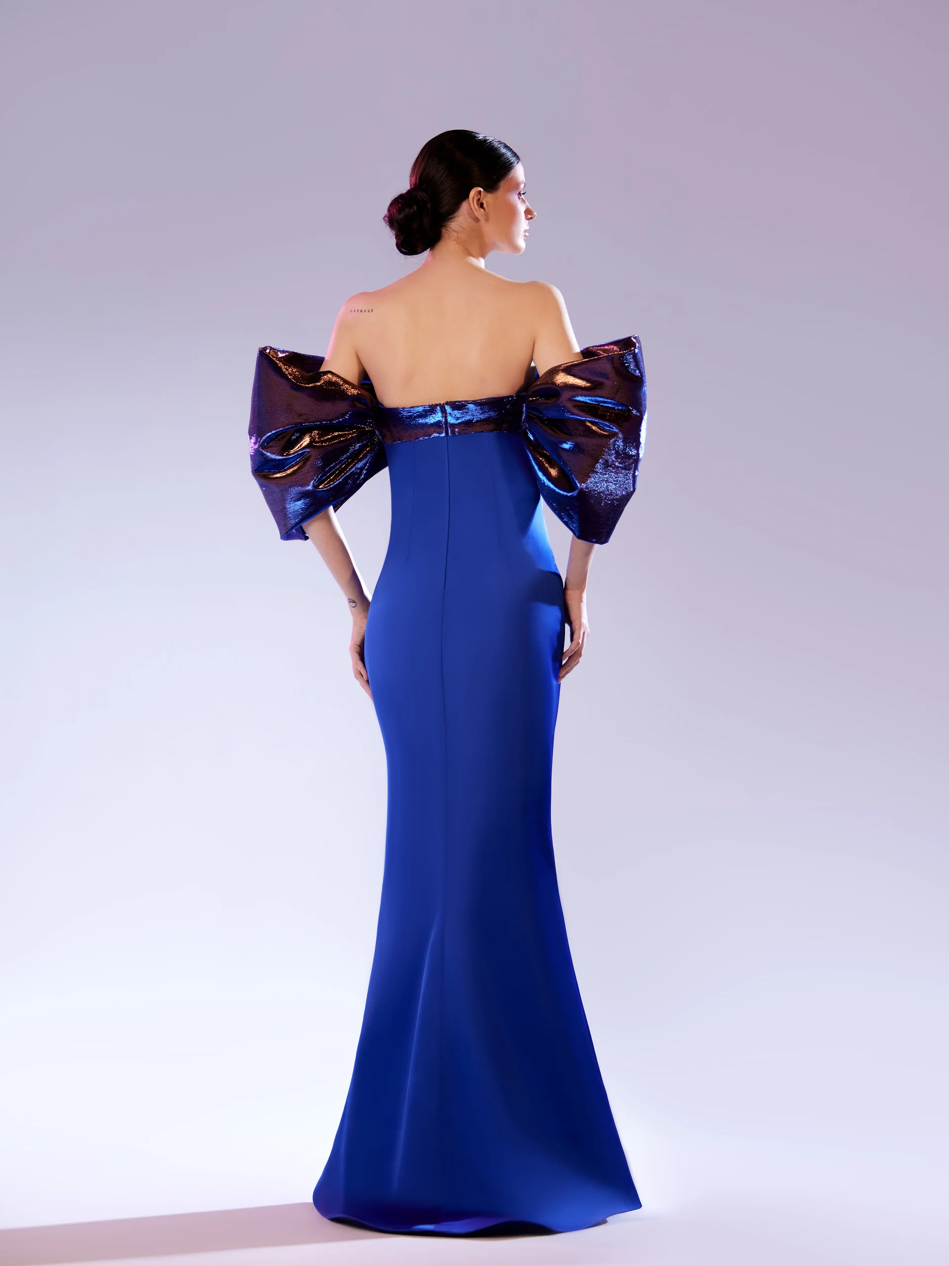 Satin evening gown with oversized metallic fabric sleeves.